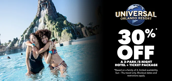 - 3-Park 5-Day Park-to-Park Vacation Package Promo Ticket** to Universal Studios Florida, Universal Islands of Adventure, and Universal Volcano Bay on the same day.