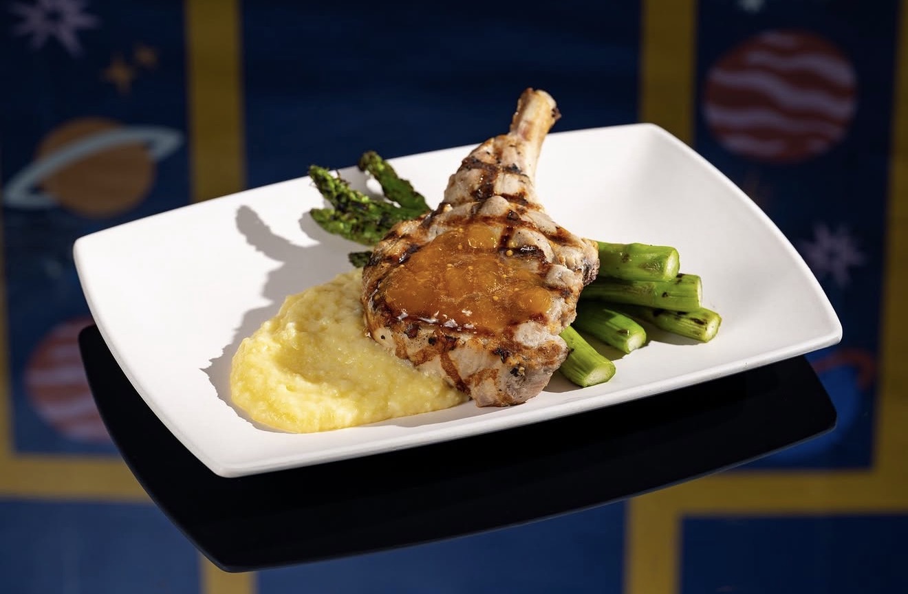 • Grilled Pork Chop served with creamy cheese polenta, grilled asparagus, and peach chutney