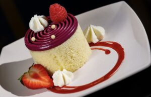 • Feature Finale Dessert featuring vanilla sponge roulade, panna cotta, fresh fruit, and whipped cream