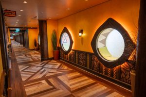 Exclusively available to Disney Destiny guests, this restaurant transports you into the African savannah as you walk down the entry hall, leading to the main dining area, a stylized version of a Boma —a place where families and communities gather to eat, sing, and share stories. The dining area is lined with depictions of animals and nature, realized through lighting and special effects. A wall of magical windows displays a rotation of vibrant sunrises and sunsets throughout the meal, reminiscent of iconic animated artwork from the original film. At the center of the venue, tiered risers resembling African drums serve as the stage for a lineup of live entertainment.